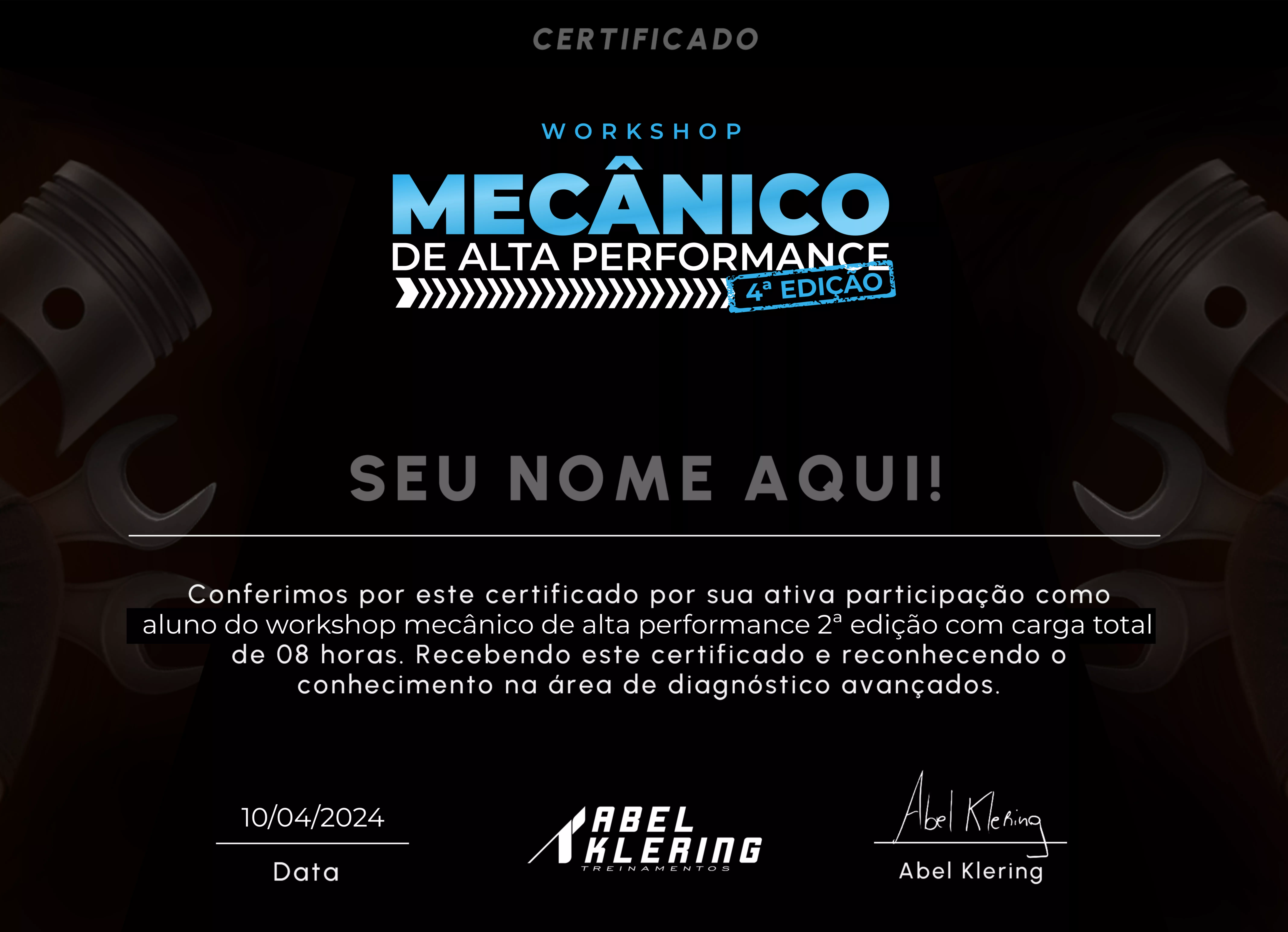 Assistas TODAS aulas e garanta seu certificado e ainda pode pendurá-lo na sua oficina. Um certificado com seu nome assinado por mim Abel Klering.